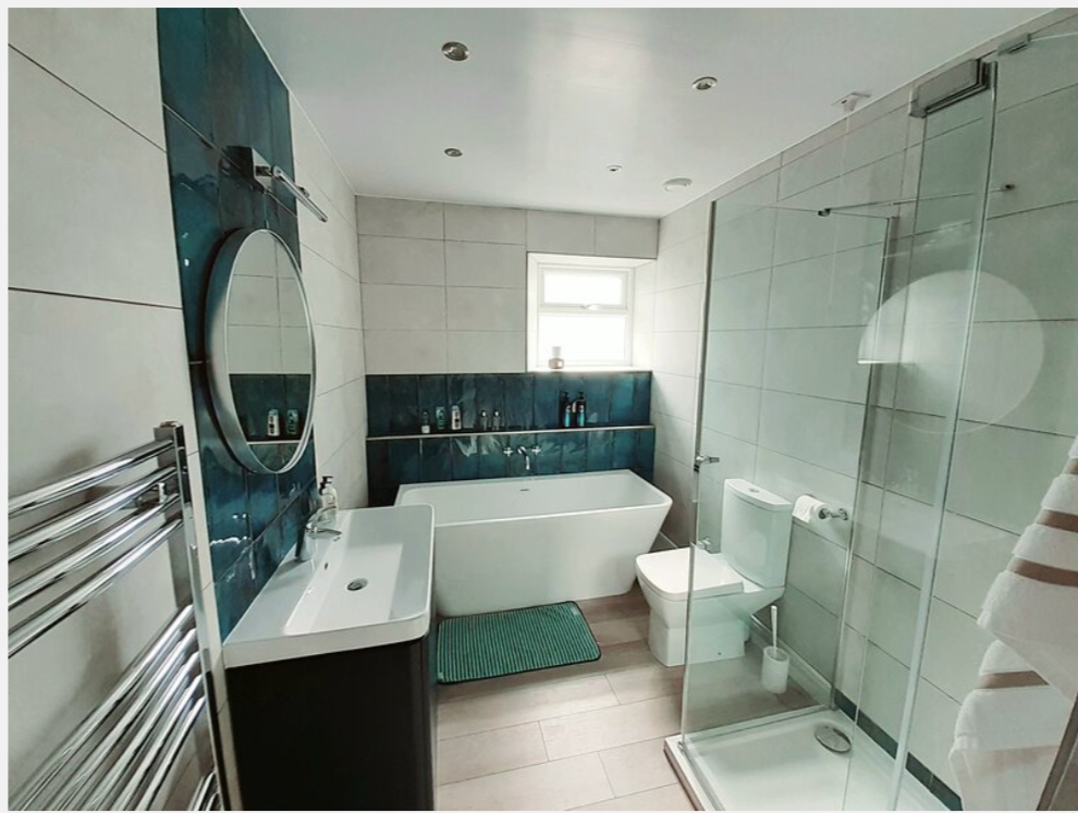 Family bathroom with feature bathtub, large shower cubicle, washbasin and WC