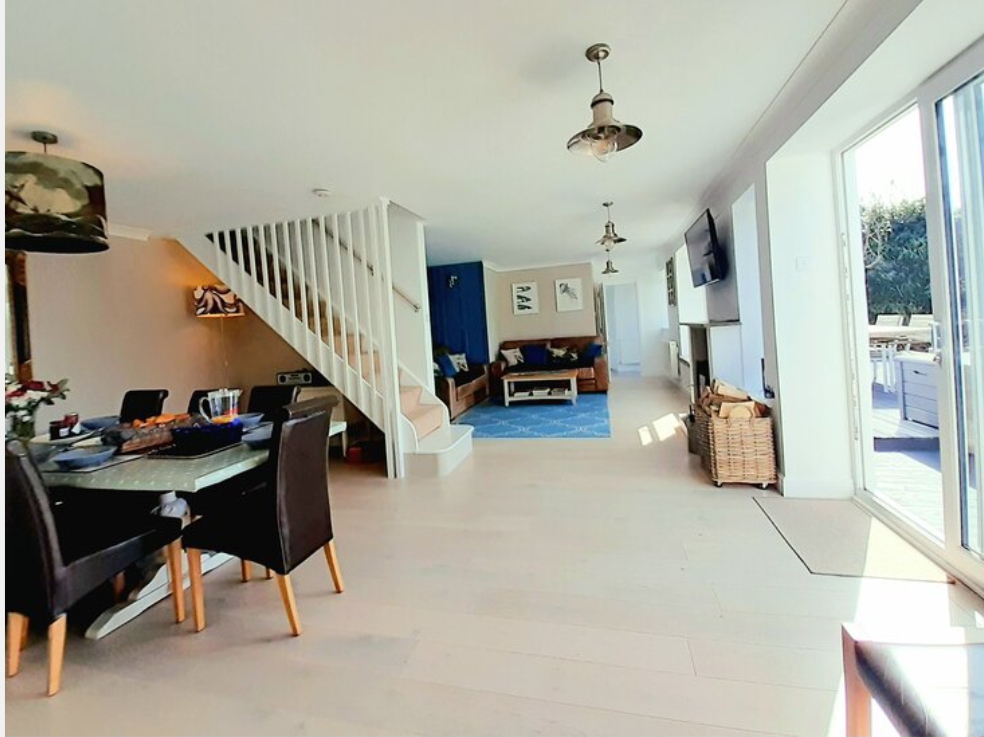 Living room with 47 inch flatscreen TV, log burner (one basket logs provided) lots of comfy seating. Large window seat overlooking deck and garden. Sliding doors to rear deck and BBQ area (bring charcoal) and garden.