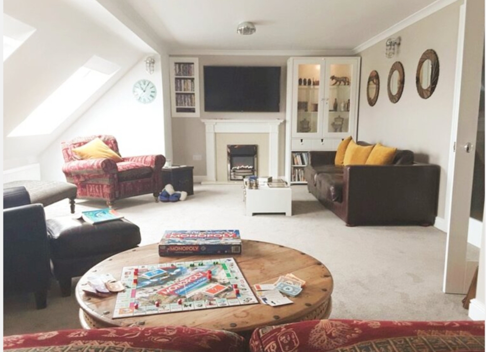 Lots of DVDs, board games, CDs and books. 55" smart TV, DVD, freeview, electric flame effect fire.