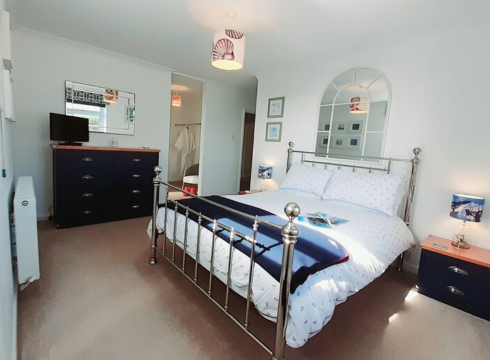 Seaview ensuite kingsize bedroom dual aspect with 5ft king size bed with extra deep mattress. With smart TV, ensuite shower room with shower cubicle, washbasin and wc and walk through wardrobe with dressing/sitting area.