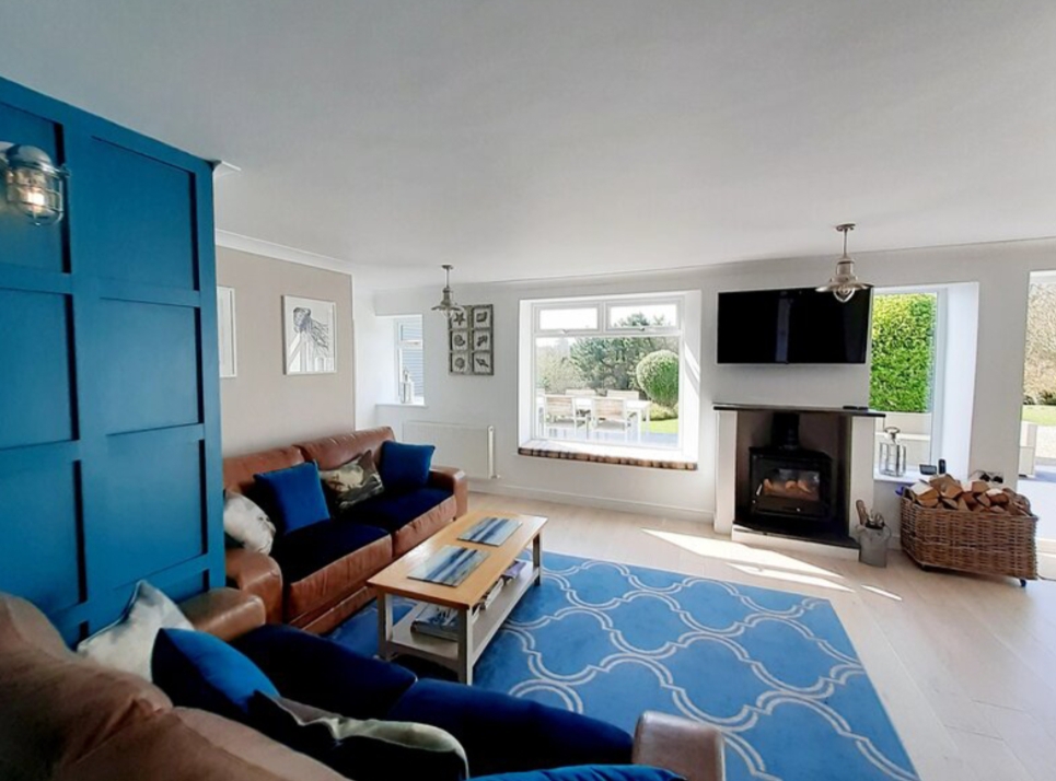 Downstairs offers a very sociable semi open plan kitchen and dining area/living room with 47 inch flatscreen TV, log burner, leading to the 30ft rear deck with views equipped with furniture and a BBQ - a great place to enjoy those alfresco meals when the sun come up or goes down. There is a further large TV lounge upstairs (boasting sea views too) – perfect for friends & family to get together to watch a movie on the 55 inch flatscreen TV/DVD or enjoy a game of Cornish Monopoly.