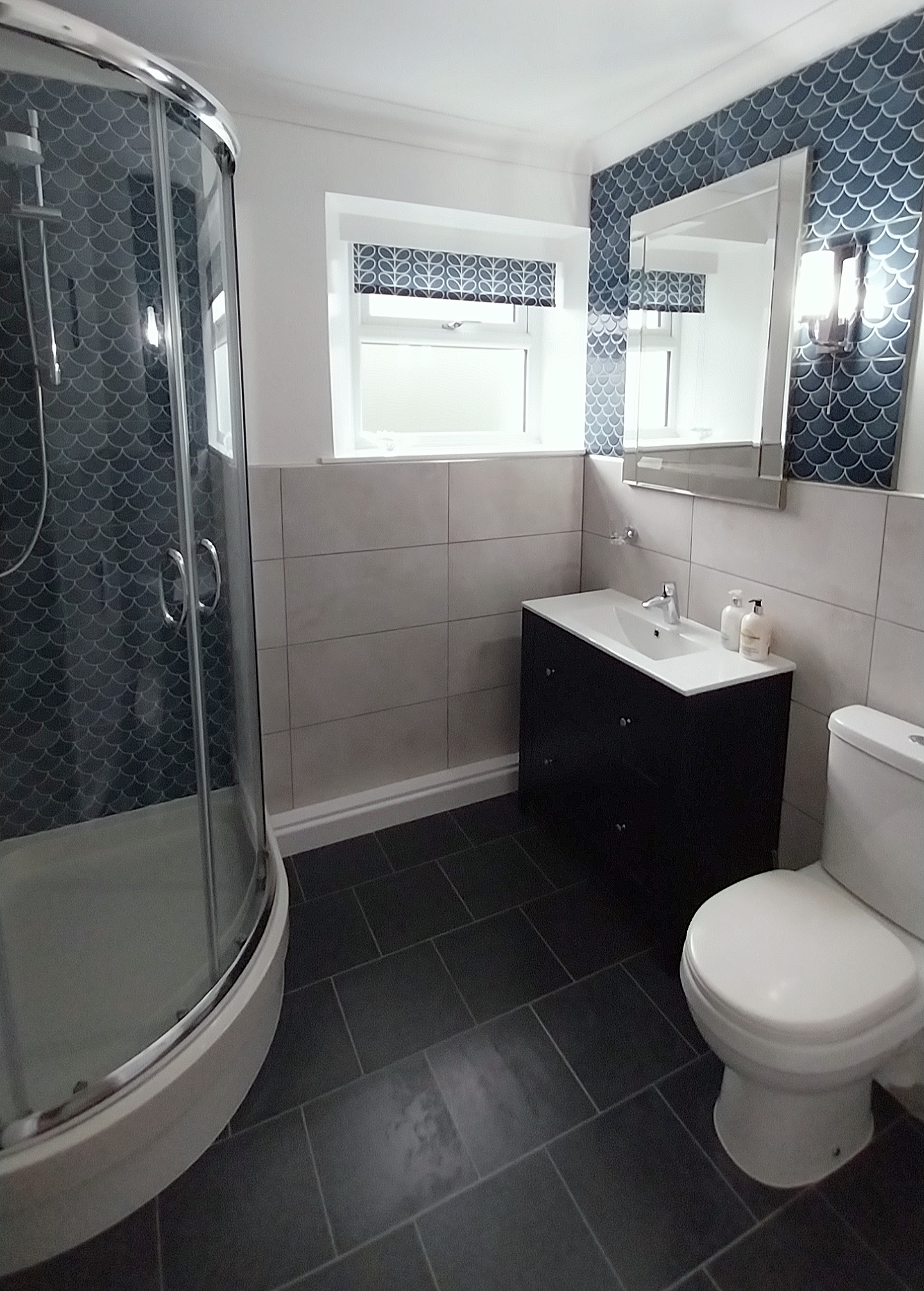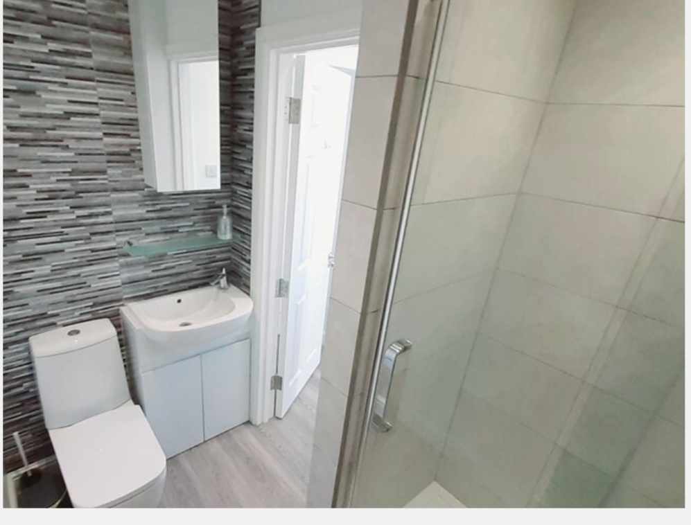 Shower room with shower cubicle, washbasin and WC.