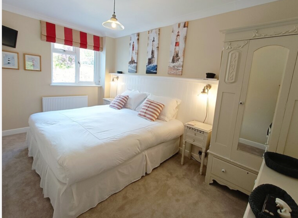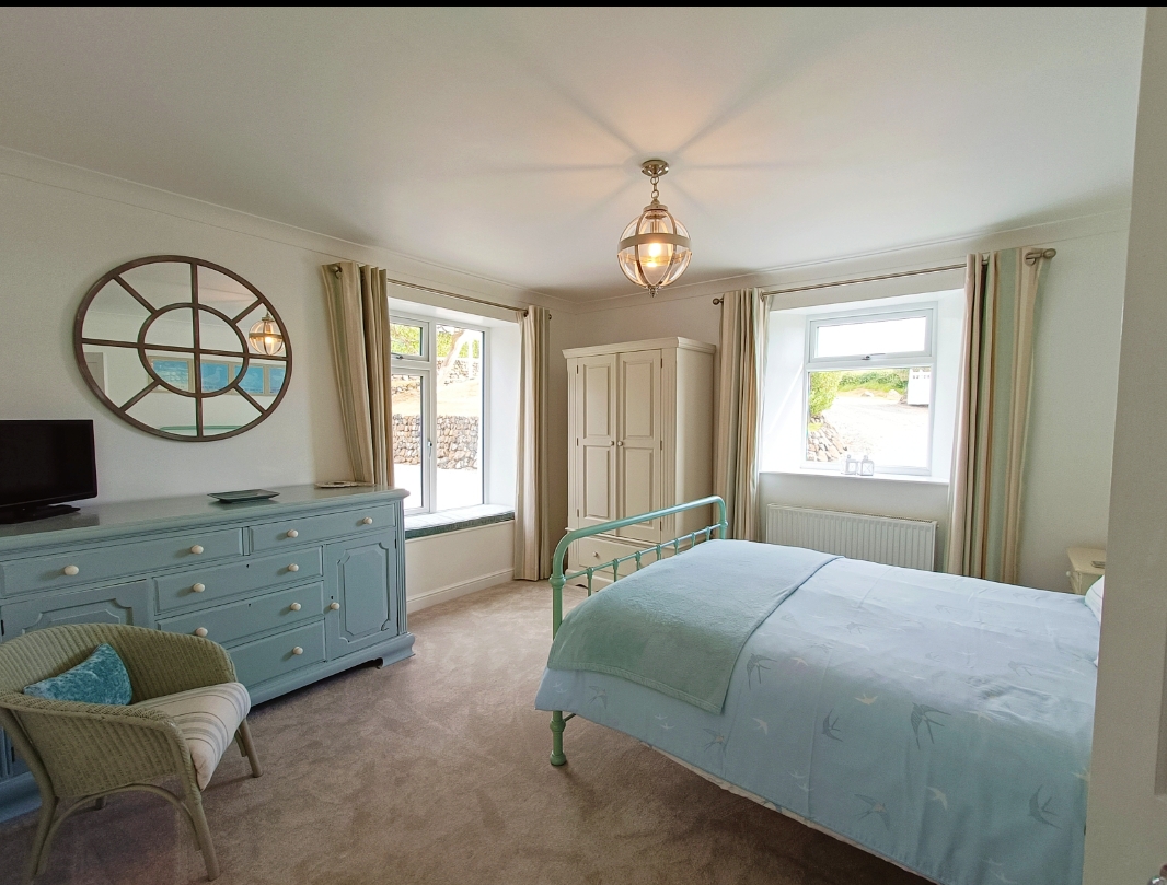 Sea facing kingsize bedroom dual aspect with 5ft wide feather & black iron bed/extra deep mattress with TV/DVD/Freeview, windowseat.